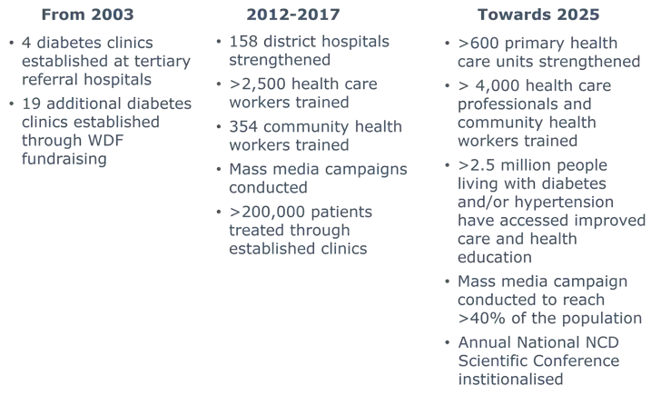 This underscores the need for better screening and care to catch and treat chronic diseases before they result in complications or early death. This is not an easy task to take on, yet WDF's support has enabled partnering organisations to bring about positive change in the access to and the quality of care in countries where we engage.